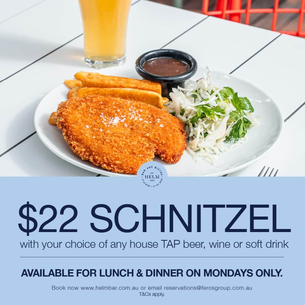 Kickstart your week with our mouthwatering Chicken Schnitzel served with crispy chips and slaw. For just $22, you’ll also receive your choice of any house tap beer, wine or soft drink.