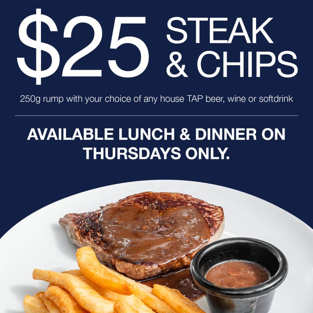 Thursday calls for our succulent Steak & Chips special. Feast on a tender 250g rump, cooked to your liking and served with crispy chips. Customize your meal with your choice of sauce and enjoy it alongside your choice of any house tap beer, wine or soft drink.