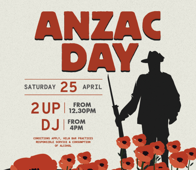 Grab your friends and come raise a glass to our Anzac’s this year at Helm. Test your luck in 2 Up from 12:30pm, followed by a DJ in the Garden kicking off from 4pm to keep the good vibes going all afternoon.